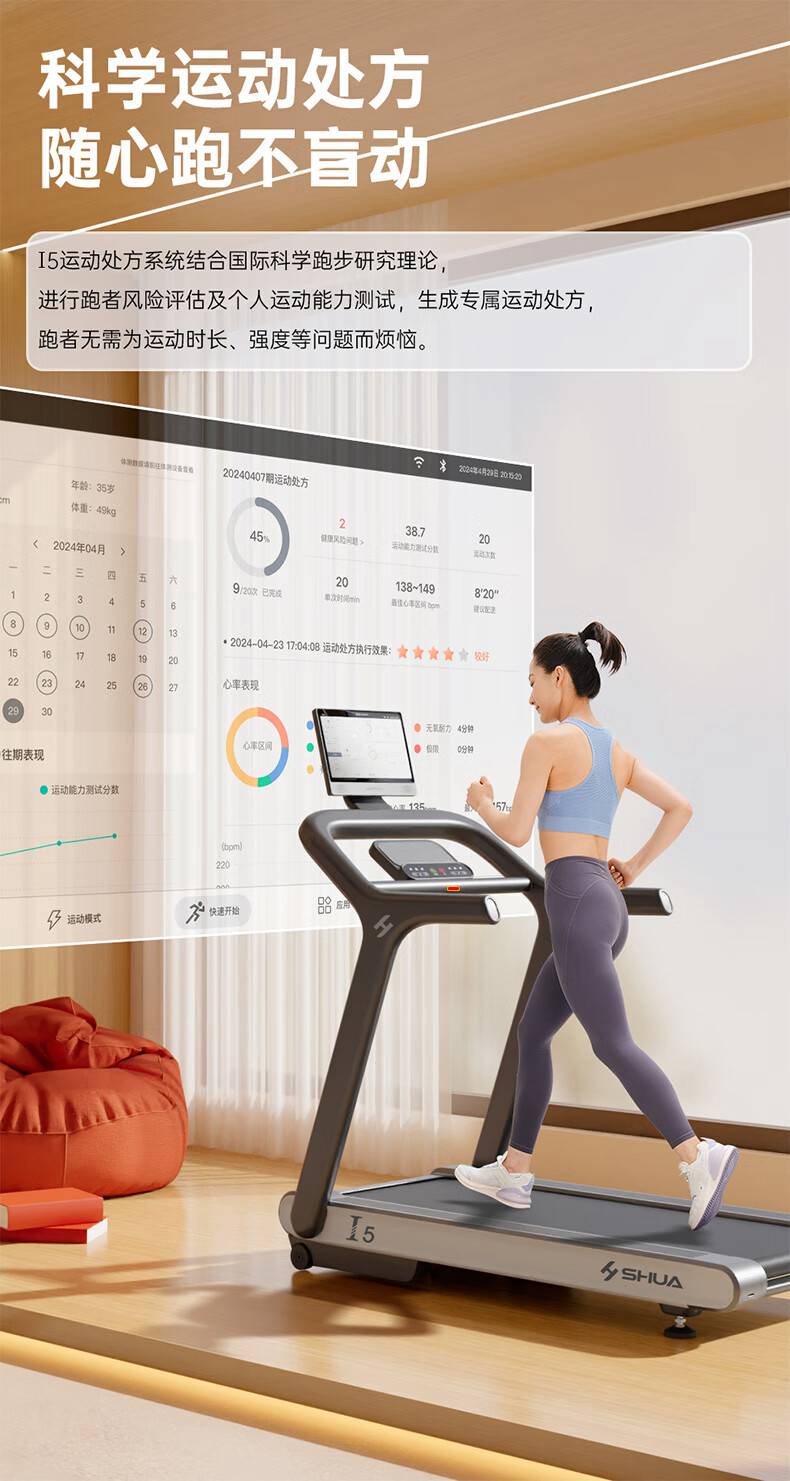 milantiyuSH-T580T I5跑步机,科学运动处方,随心跑不盲动,可根据个人运动处方心率区间及跑者的实时心率情况,自动调节速度或坡度,犹如你的专属“配速员”让你随“心”而跑无负担。