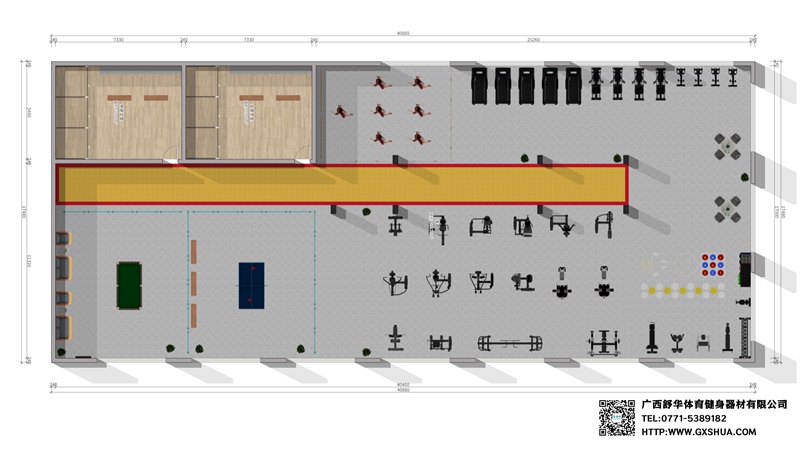 此方案要求面积小于600m²,适用于企事业单位、酒店会所、楼盘社区、学校、商用健身房等健身场所,能满足40-60人同时健身使用。(方案根据场地空间大小、预算、产品需求等进行配置仅为启发性参考)