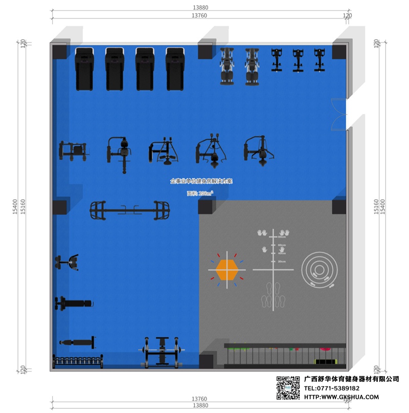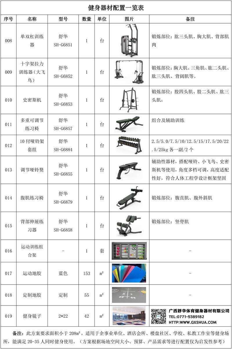 此方案要求面积小于208m²,适用于企事业单位、酒店会所、楼盘社区、学校、私教工作室等健身场所,能满足20-35人同时健身使用。(方案根据场地空间大小、预算、产品需求等进行配置仅为启发性参考)
