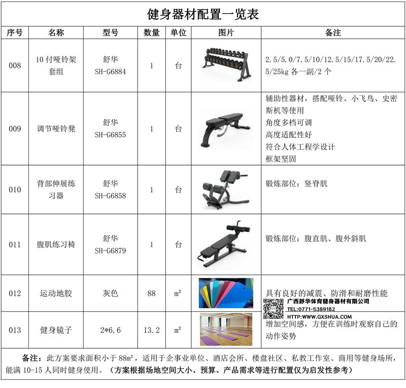 此方案要求面积小于88m²,适用于企事业单位、酒店会所、楼盘社区、私教工作室、商用等健身场所,能满10-15人同时健身使用。(方案根据场地空间大小、预算、产品需求等进行配置仅为启发性参考)