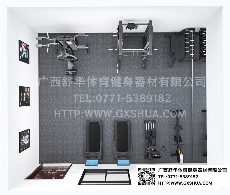 企事业单位健身房是员工健康的守护站。久坐、长期面对电脑等工作模式容易引发各种健康问题,而健身房里的专业设备和训练空间,可以帮助员工预防和缓解诸如颈椎痛、腰椎间盘突出、肥胖等问题,提高身体的柔韧性、力量和耐力,保障员工以良好的身体状态为单位创造价值。基于这些独特功能,我们为这个48m² 的小型企事业单位健身房设计了如下配置方案。