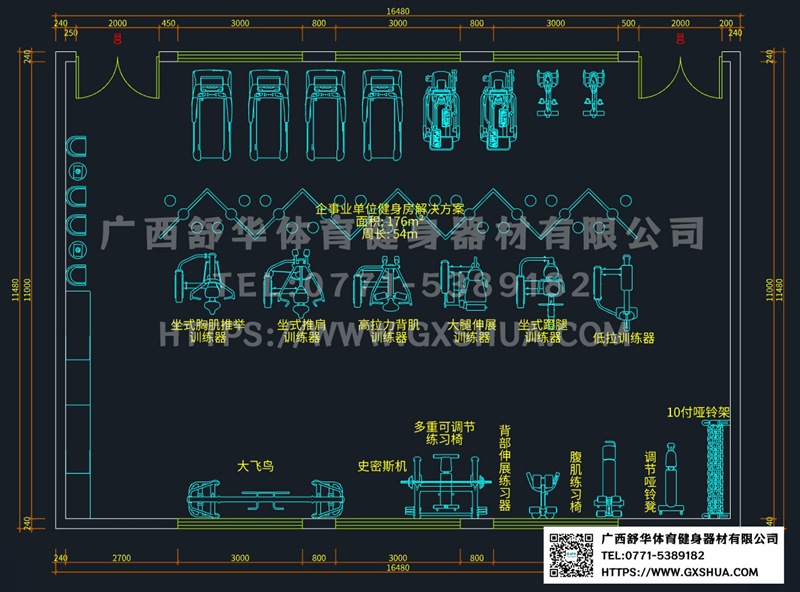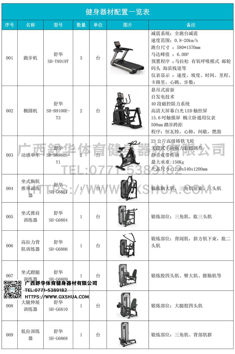 大飞鸟(1台),史密斯机(1台),多重可调节练习椅(1台),背部伸展练习器(1台),腹肌训练器(1台),10付哑铃套组(1套),可调哑铃凳(1张),可以实现对不同肌肉群的针对性训练,满足肌肉训练需求,全方位激活身体机能。