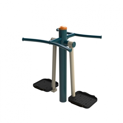 面对器械,双手握紧扶手,双脚站立于踏板上,腰部发力带动下肢做钟摆式运动