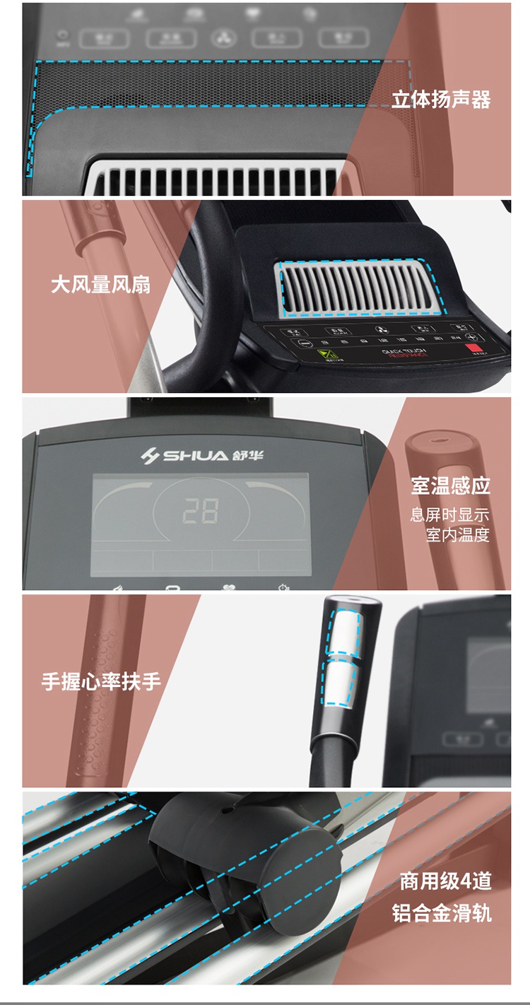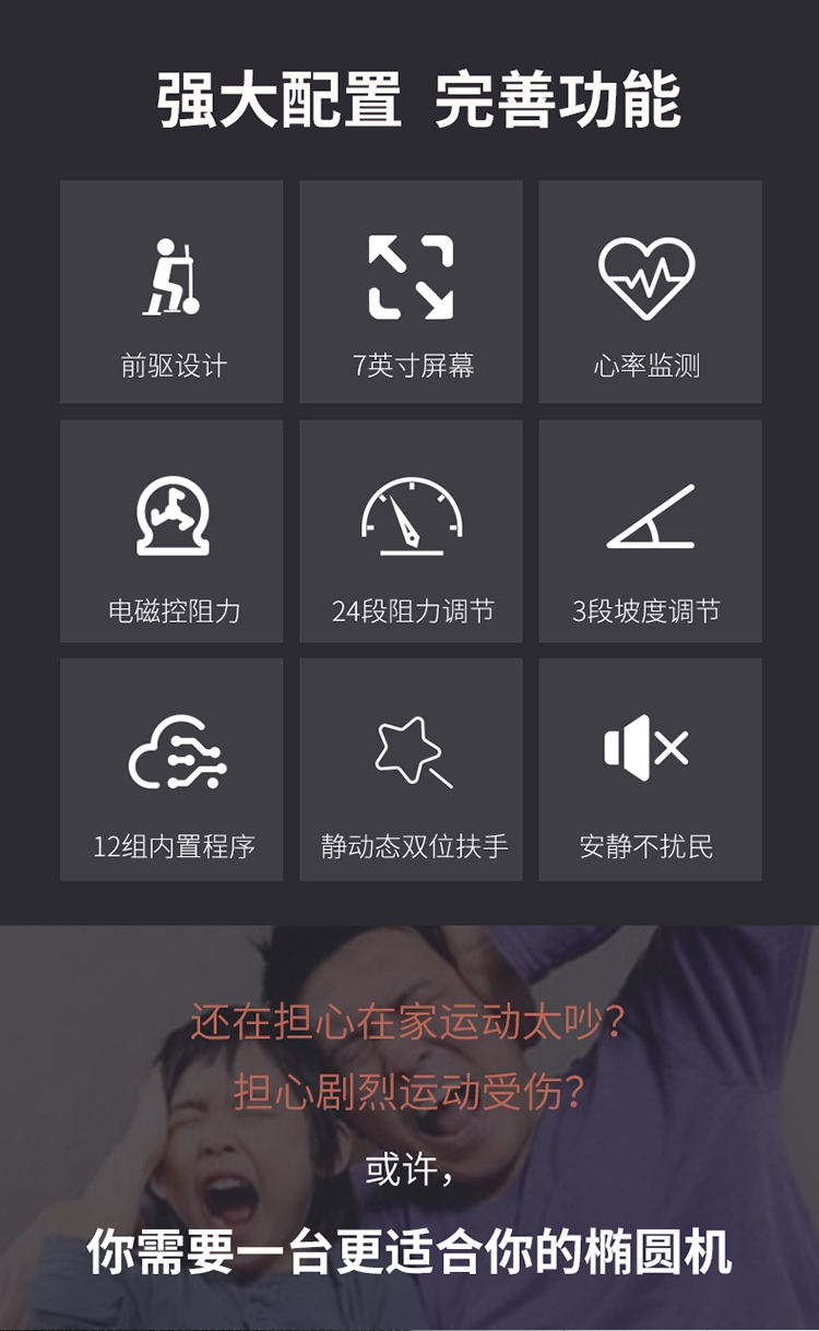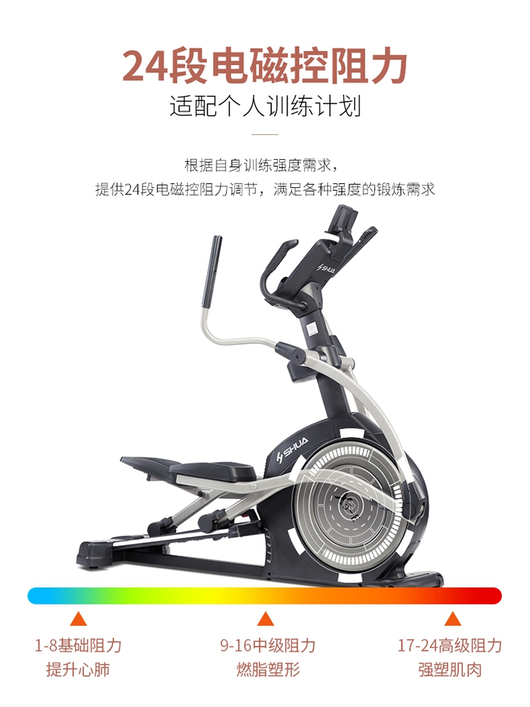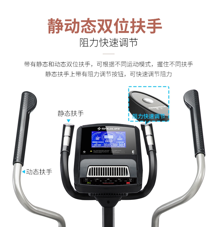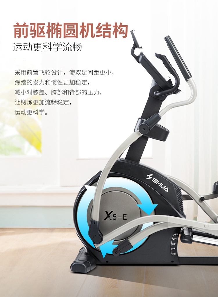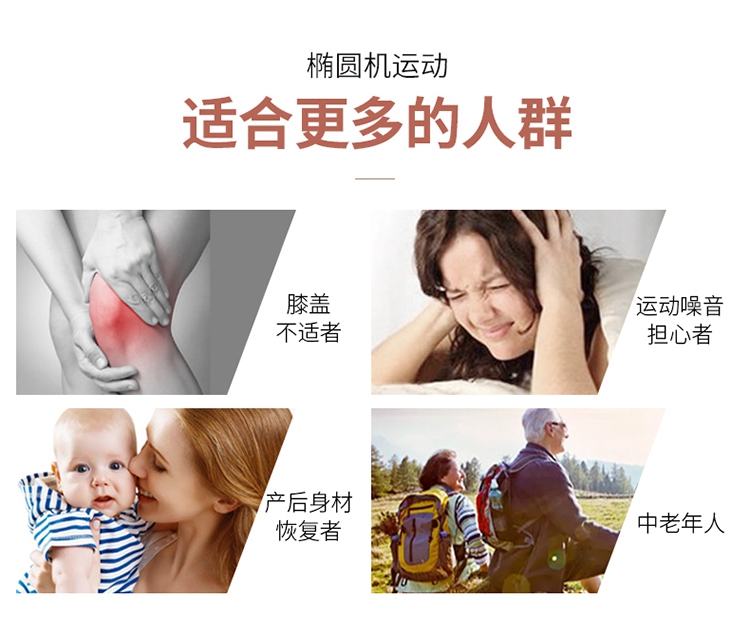 椭圆机是一种主动运动方式,能预防、降低、缓解颈椎病、肩周炎等疼痛。而且,在使用室内健身器材-椭圆机时,因为膝盖不是着力点,所以对膝关节的冲击力也很小,很大程度降低了给膝盖造成损伤的可能性,安全性大大提升,更为重要的是,室内健身器材-椭圆机运动强度不大,适合体重过重的肥胖人群使用。它既适用于大众人群进行锻炼,更适合不同人群,还适合康复训练、产后人群恢复训练等。
