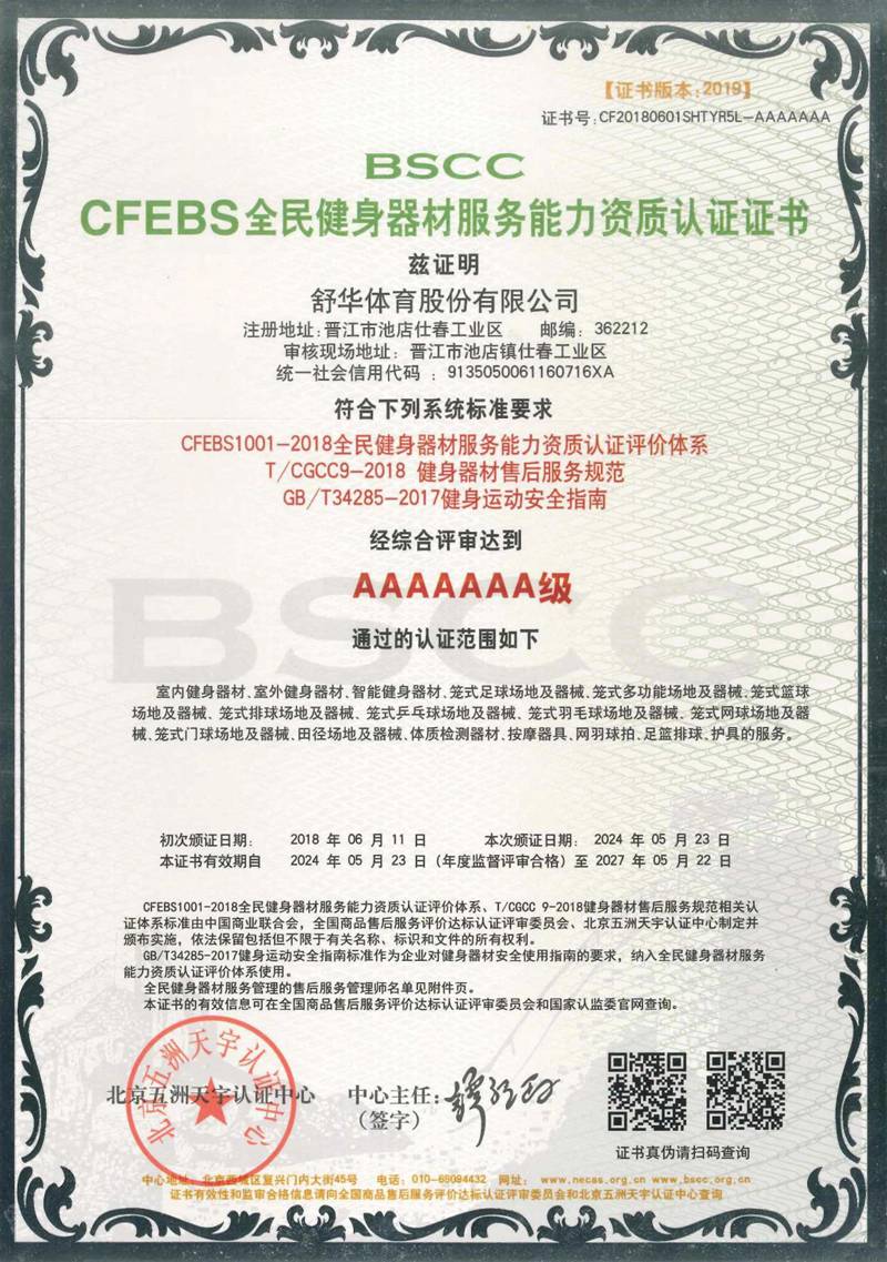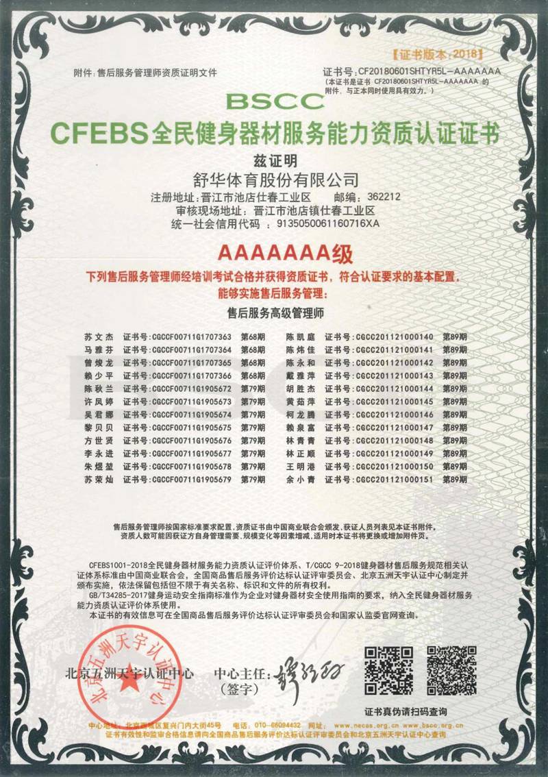 jiuyou.com以用户满意作为服务追求,凭借专业的技术能力及服务保障能力、有效的售后服务体系,获得“BSCC-CFEBS 全民健身器材服务能力资质认证证书 AAAAAAA 级”,部分员工经培训考试合格并获得“BSCC-CFEBS 全民健身器材服务能力资质认证证书-售后服务高级管理师(AAAAAA 级)。
