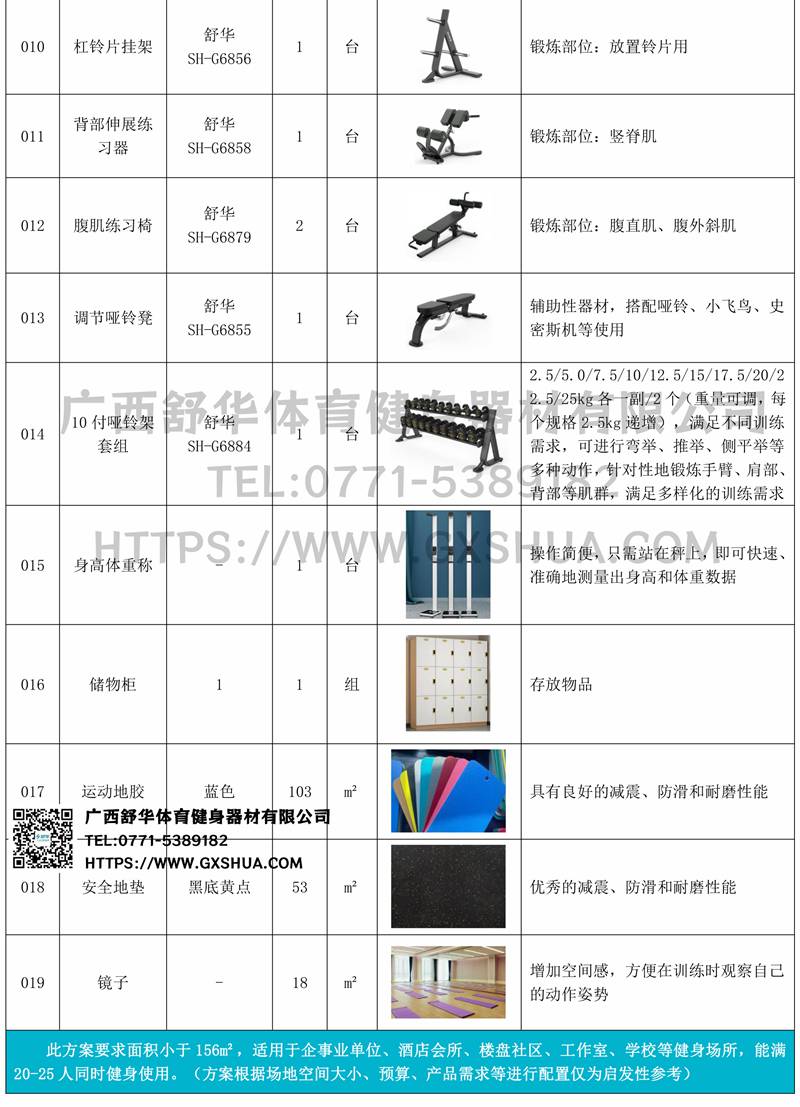 此方案要求面积小于156m²,适用于企事业单位、酒店会所、楼盘社区、工作室、学校等健身场所,能满20-25人同时健身使用。(方案根据场地空间大小、预算、产品需求等进行配置仅为启发性参考)